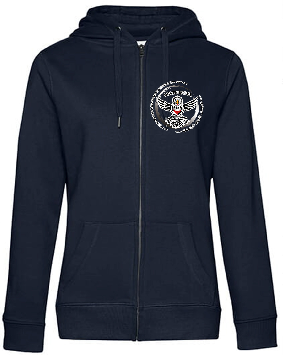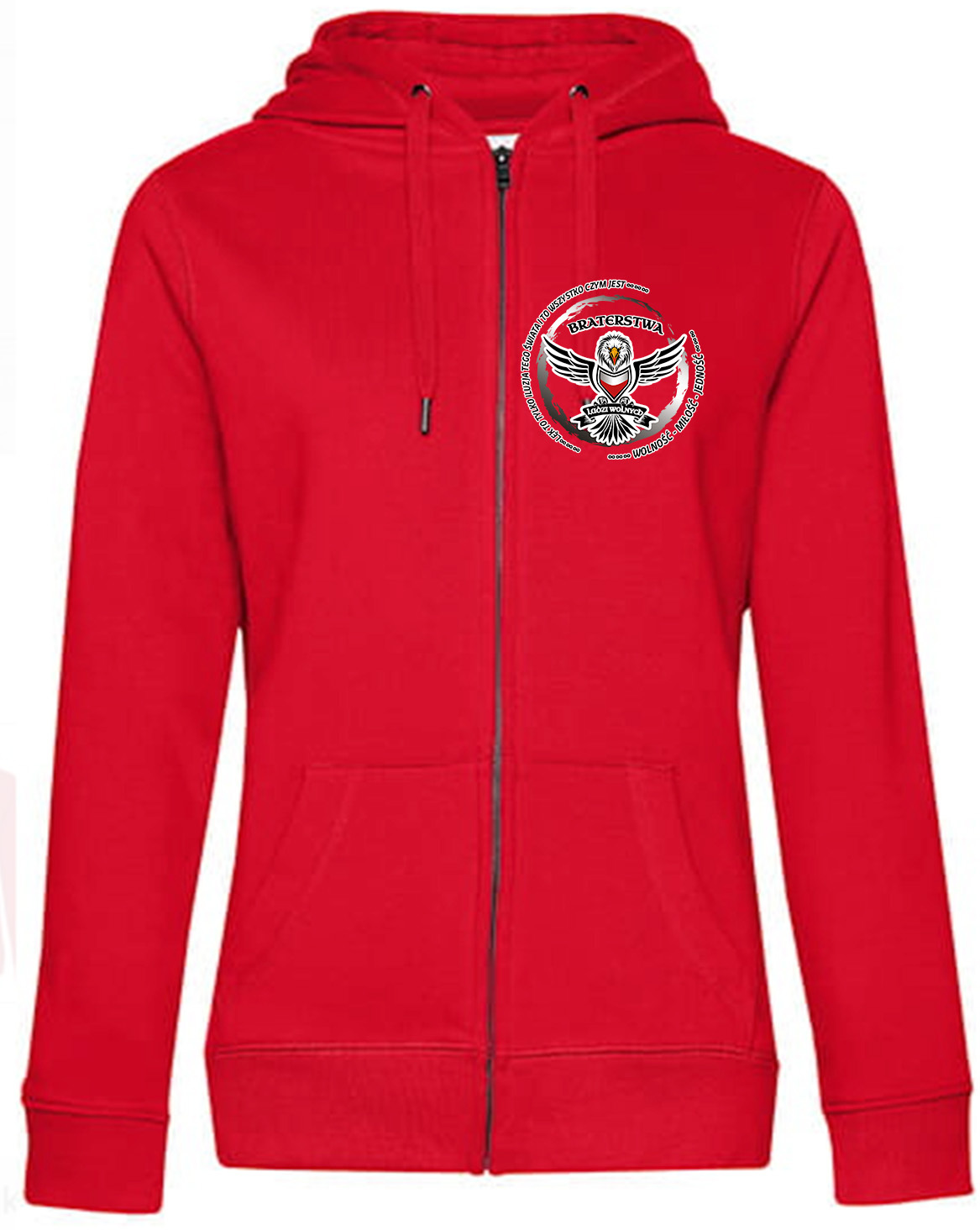 Damska Bluza z nadrukiem loga Braterstw z przodu i z tyłu w trzech kolorach: czerwona, biała i granatowa.