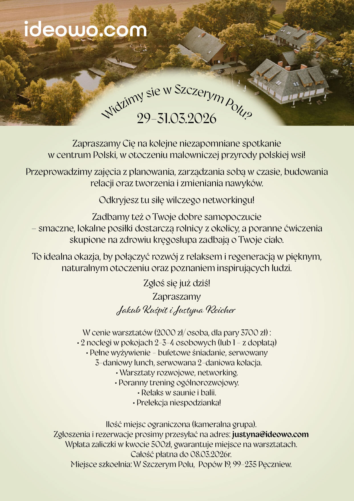 Cudowne miejsce, klimat, który stworzyła Justyna wraz z Jakubem. Cieszę się i jestem Wam ogromnie wdzięczna za te wspaniałe warsztaty w Szczerym Polu, widać wkładane w to serce, zaangażowanie, życzliwość i chęć tworzenia tej cudownej przestrzeni dla ludzi świadomych :)"
