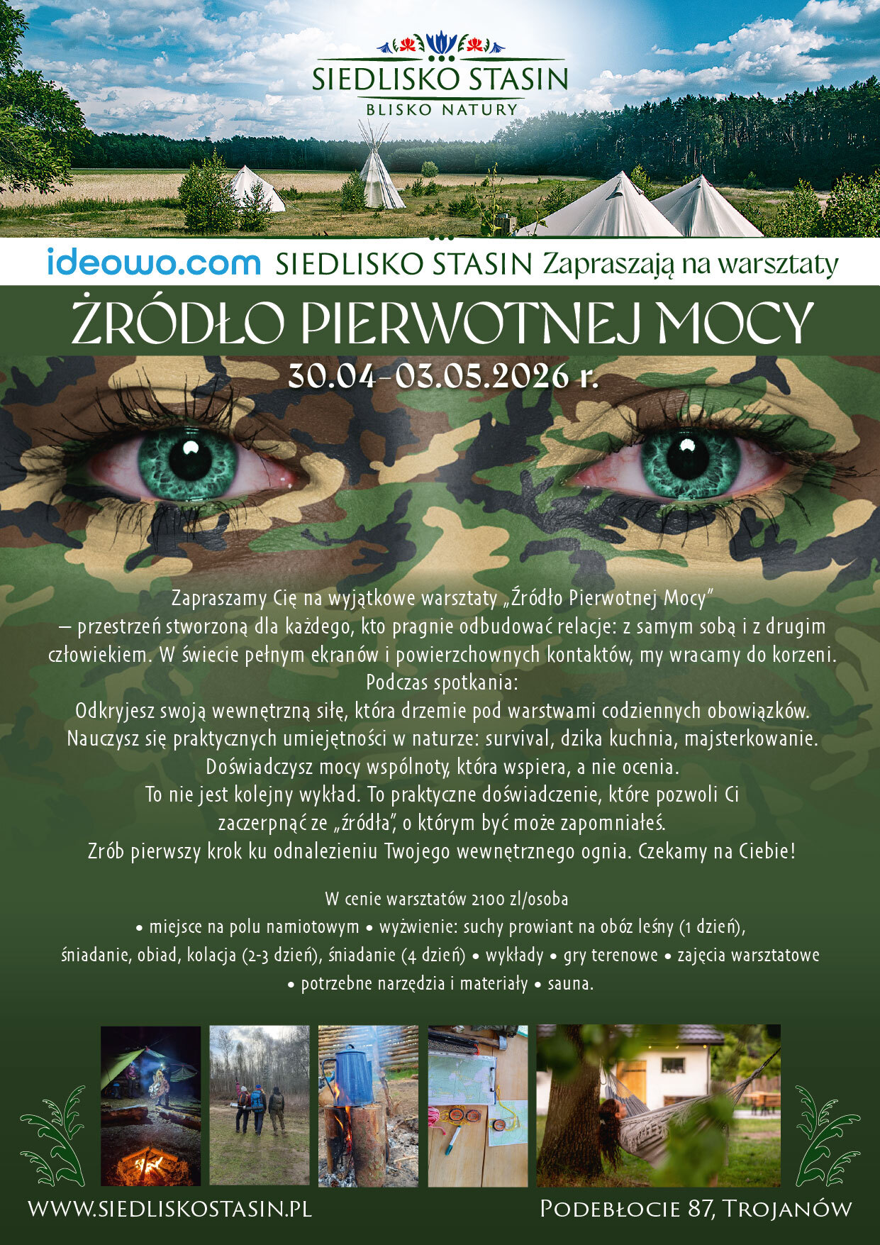 • wyżwienie: suchy prowiant na obóz leśny (1 dzień), śniadanie, obiad, kolacja (2-3 dzień), śniadanie (4 dzień)