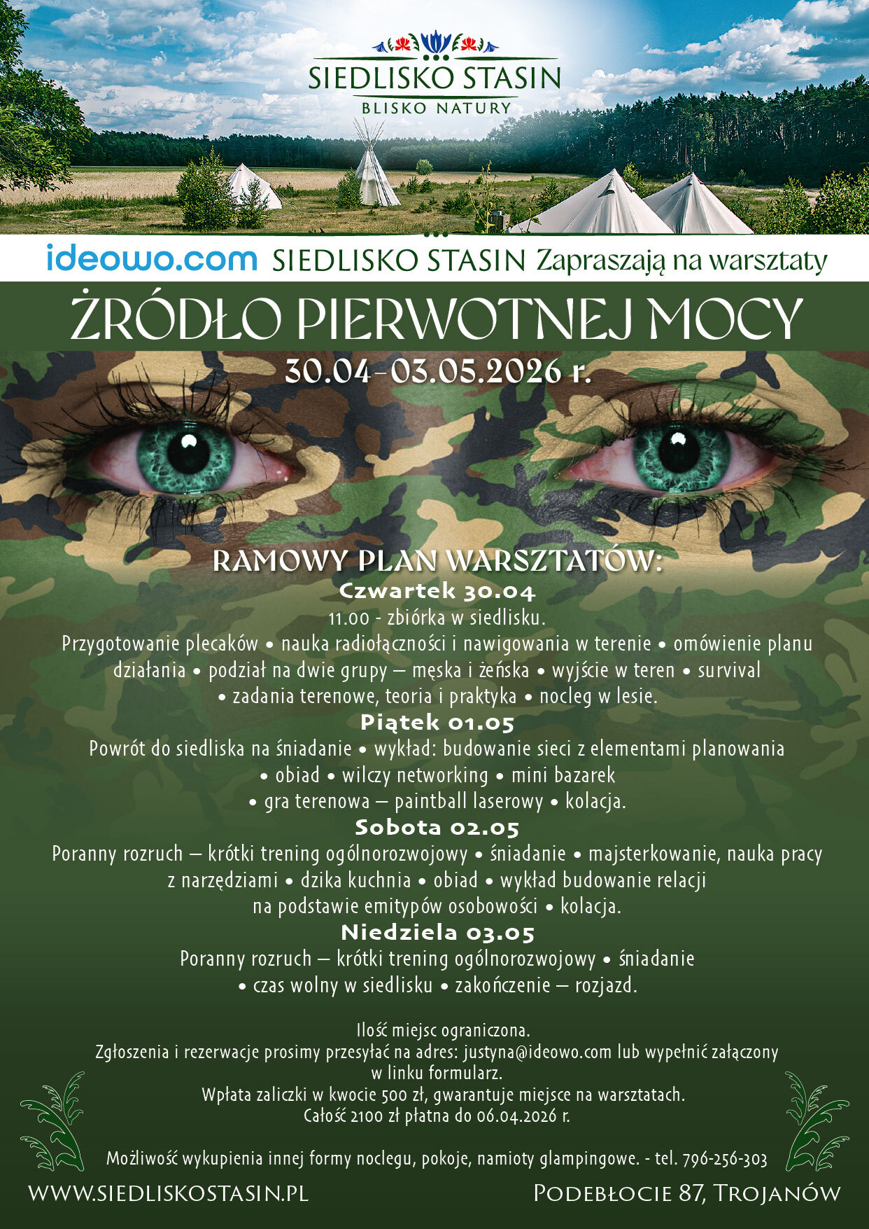 Możliwość wykupienia innej formy noclegu, pokoje, namioty glampingowe. - tel. 796-256-303